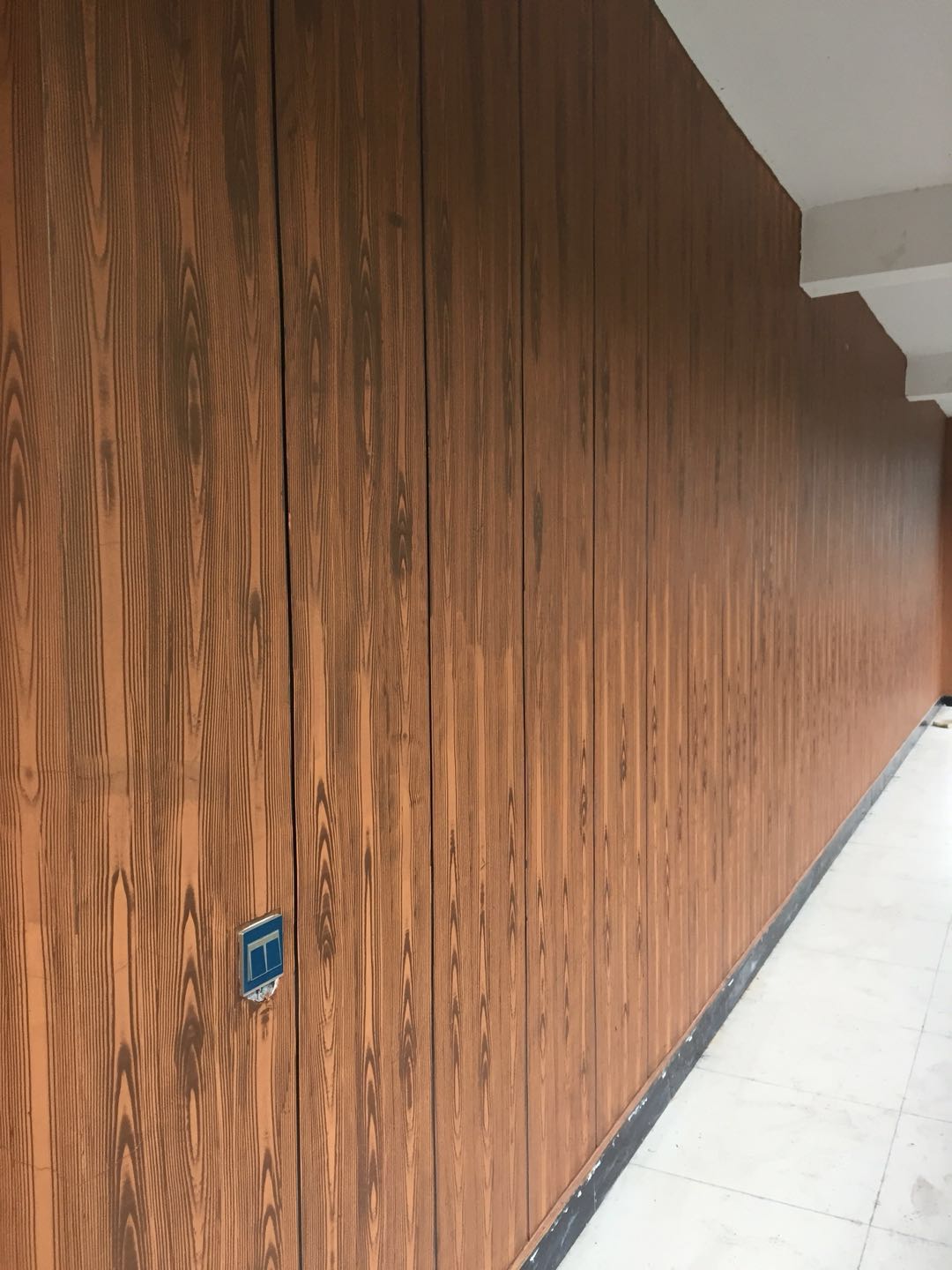 很多客戶會問這種分格效果是如何做出來的,其實分格效果是通過一種專用的美紋紙來操作的,施工前需要確定分格的間距和每個分格內需要拉幾道紋路,先根據劃分好的間距貼上這種專用的雙面美紋紙,然后進行仿木紋漆 的施工,等木紋漆做好后再撕掉表面的一層美紋紙,這樣露出黑色的底紋,這樣一個完整的分格木紋效果就做好了。