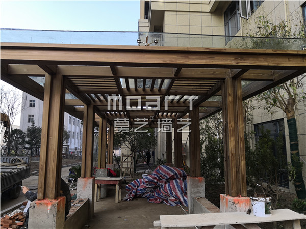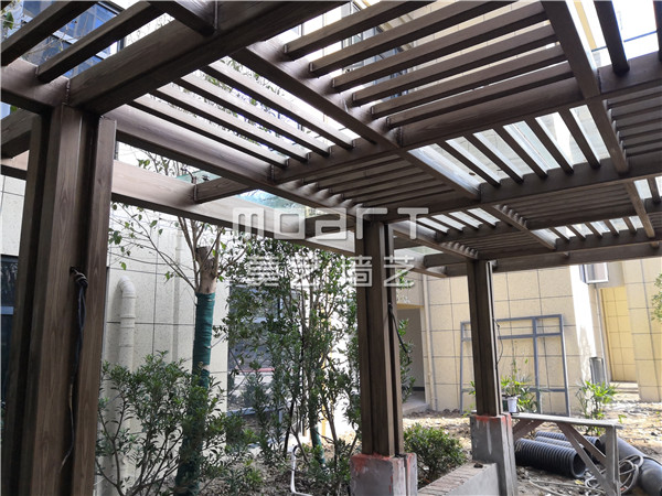 眾多景觀中均可見(jiàn)到一棟棟小木屋,木質(zhì)涼亭,木質(zhì)景觀臺(tái)。這些木質(zhì)建筑讓景觀增添了更多的自然韻味。然后這些建筑并非是木材搭建的,而是使用金屬材料+仿木紋漆做成的。這些景觀涼亭擁有鋼構(gòu)的內(nèi)在,木紋的外表。